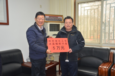 春節將至,暖意濃濃。各級領導心系困難職工。1月24日下午,陜西省總工會黨組成員、副主席張永樂一行5人,深入我公司開展送溫暖活動。集團公司黨委委員、副總經理、工會主席白林科,工會常務副主席張漢軍等陪同慰問。張永樂詳細了解了公司生產經營情況與發展中面臨的困難與問題,以及“春節”前我公司幫扶服務工作的開展情況。張永樂副主席充分肯定了我公司的各項工作,代表省總向公司廣大職工致以新春的問候!努力把以習近平同志為核心的黨中央對廣大職工群眾的關心關懷送到職工群眾的心坎上。座談會后,張永樂一行先后到因病致困職工王玉霞和西安市勞動模范董紅毅家中進行了走訪,仔細了解了他們的生活情況,并送上慰問金和慰問品。